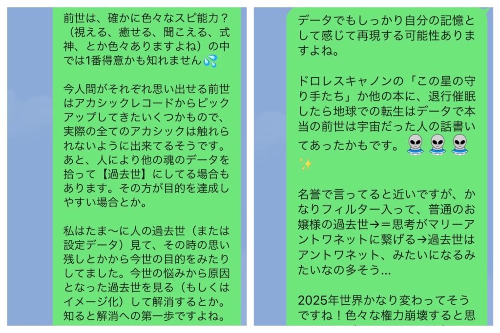 過去世と言っても、下のLineの通り生きている人間のアカシックレコードのピックアップ過去世は一部だし、その過去世も他の魂のデータを通ってきていたり、そもそもそんな体験してなくてデータのみを入れてきてる人もいます(そんな人滅多にいないと思いますが)何故かというと、その方が今回の人生の目的を達成しやすいから。