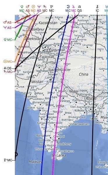 更に昔、友人が南インドのラマナ・マハルシのアシュラムとアルナーチャラが凄かったと言っていたのを思い出し場所を調べてみると、なんとアストロマップ上の私のMC木星ライン(下図ピンクの線)とばっちり重なっていました。簡単に言うとMCラインは社会運、木星は幸運や富、成功などを表します。